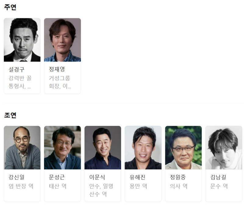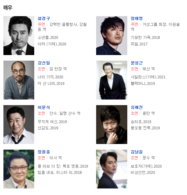 이 영화의 출연진은 매우 화려합니다. 주연인 강철중 역은 설경구가 맡았으며, 그의 연기는 이 영화의 핵심 요소 중 하나입니다. 정재영은 강철중의 적인 이원술 역을 맡아 강렬한 존재감을 발휘합니다. 그 외에도 강신일, 문성근, 이문식, 유해진, 정원중, 김남길 등 다양한 배우들이 출연하여 각자의 역할을 충실히 소화하고 있습니다.
